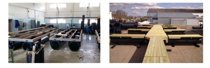 На основе широкой производственной линейки полиэтиленовых спиральновитых труб возможно изготовление плавучих модулей большого диаметра, а именно внутренними диаметрами до 2400 мм с толщиной стенки до 150 мм, что позволяет устраивать в них внутренние помещения – трюмы различного назначения.